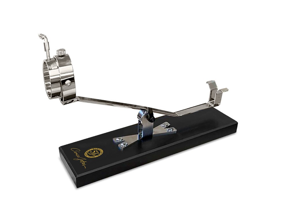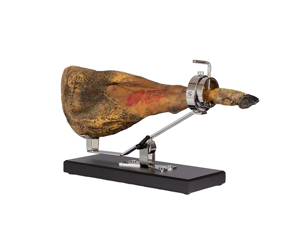 Стильное тёмно-синее метало-керамическое основание этой подставки отображает всю элегантность бренда. Поддерживает несколько положений, позволяет позиционировать ветчину как вертикально, так и горизонтально в соответствии с потребностями нарезки хамона. Невероятный аксессуар всегда держит ветчину в идеальном положении, чтобы обеспечить наиболее оптимальный угол нарезки.